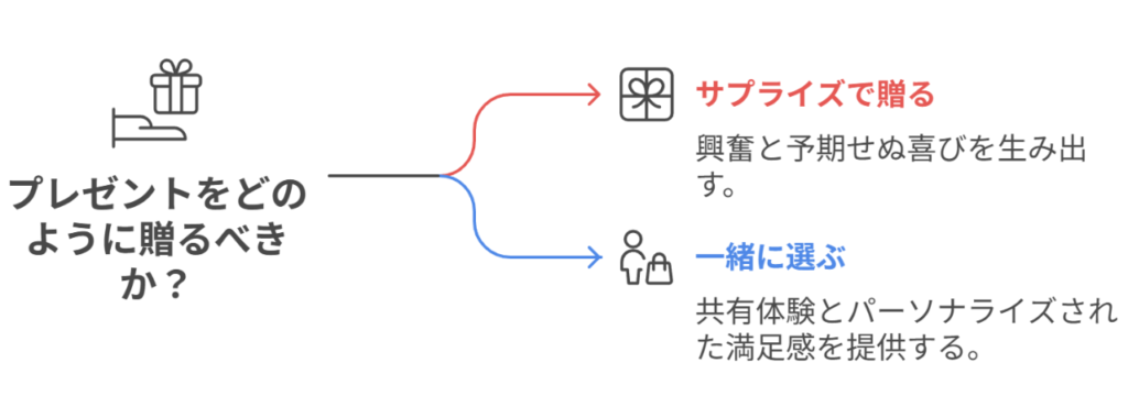 プレゼントの渡し方は大きく分けて「サプライズで贈る」か「一緒に選ぶ」かの2パターンがあります。