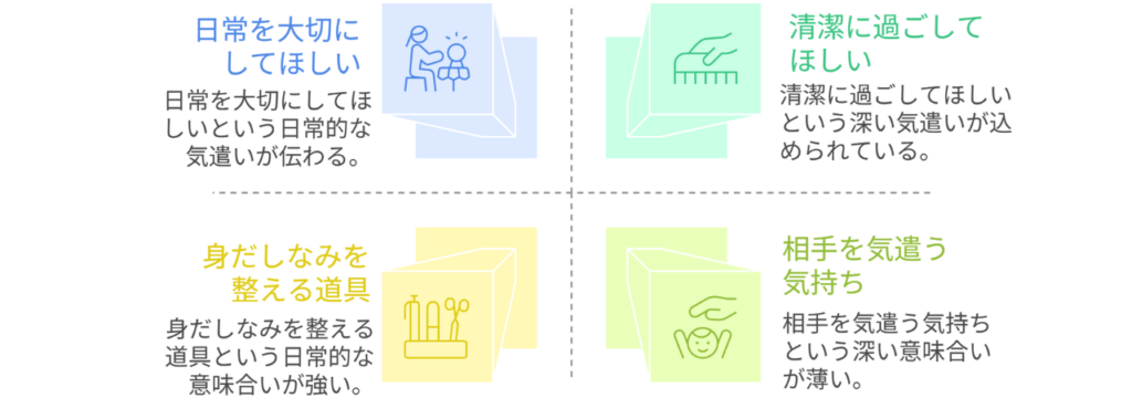 そのためプレゼントとしては、「清潔に過ごしてほしい」「日常を大切にしてほしい」という