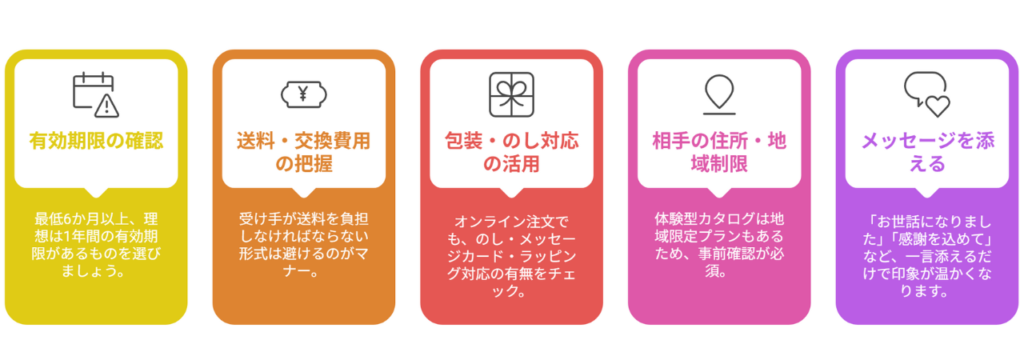 体験型カタログは地域限定プランもあるため、事前確認が必須。 - メッセージを添える