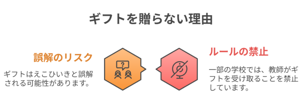 もしルールに反してプレゼントを渡してしまうと、先生自身が立場的に困るだけでなく、せっかくの気持ちが逆効果になってしまう可能性があります。
