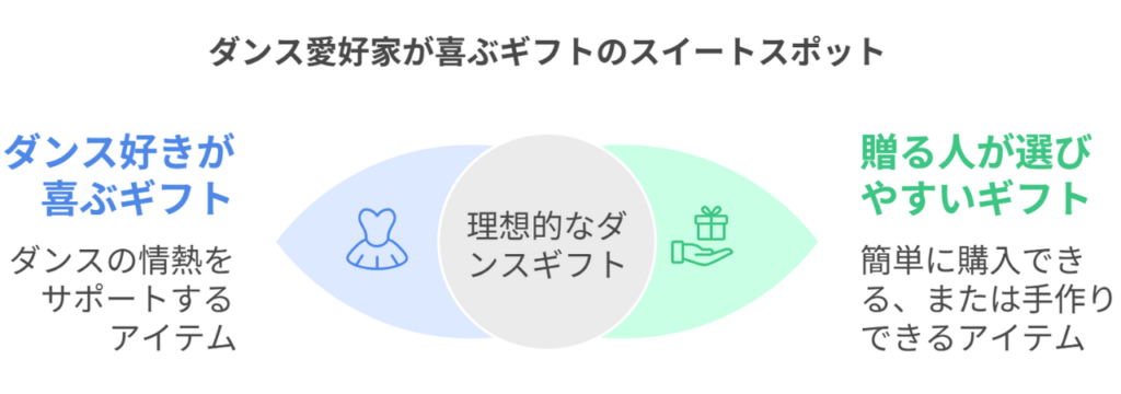 ダンサーがもらって嬉しいプレゼントを、ダンスをする人を想定して「贈る側=あなた」が選びやすいように整理しました。