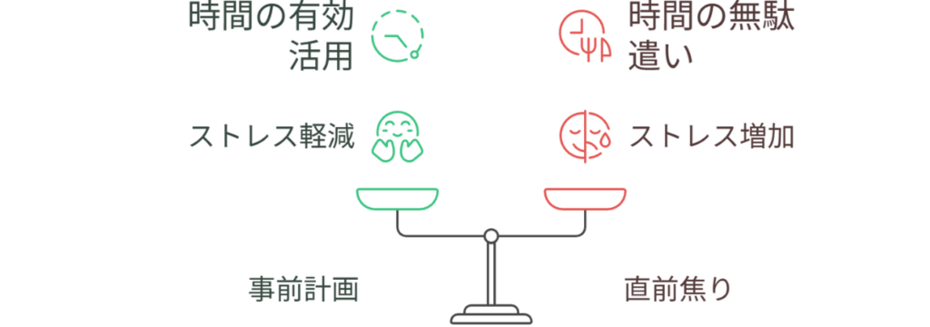 特に忙しい社会人は、事前計画がないと直前で焦るリスクが高くなります。